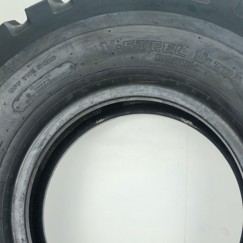 The 14.00R24 Bridgestone V-Steel Ultra Traction is an exceptional tire when it comes to being cut and impact resistant. The steel belts are developed to be able to withstand obstacles such as sharp rocks and other debris found on jobsites. This gives the tire an extended life and helps prevent a lengthy downtime. The sidewalls are made flexible while the tread is made stiff so that the stability is better for the machinery and a lot more comfortable for the operator. This non-directional pattern is aggressive and is also self cleaning, while also providing a powerful traction whichever direction it moves, whether it goes through mud, soil, gravel and very uneven surfaces.